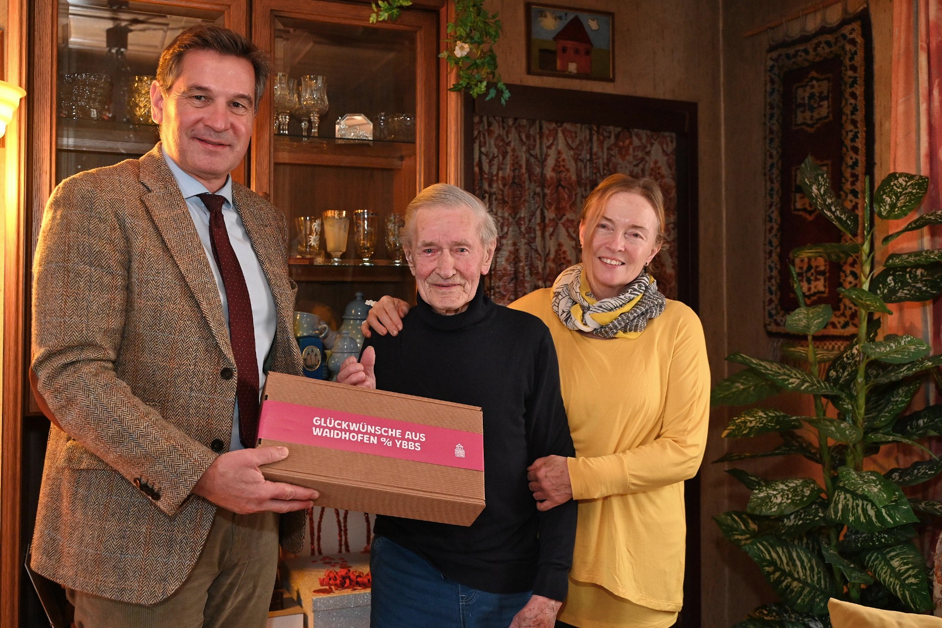Der Bürgermeister gratulierte herzlich und überreichte dem Jubilar ein Geschenk der Stadt Waidhofen. Außerdem überbrachte er die Glückwünsche der Landeshauptfrau Johanna Mikl-Leitner zu diesem Jubiläum.